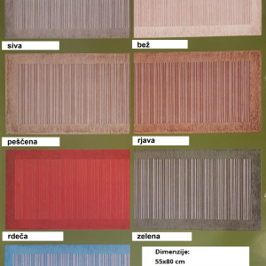 So preproge tekstilne sestave mešanice bombaža, akrila in poliestra. Preproge se lahko enostavno strojno perejo in imajo posebno proti drsno podlogo iz pene, ki je vzdržljiva tudi na strojno pranje. Na voljo so v različnih dimenzijah in barvnih tonih.